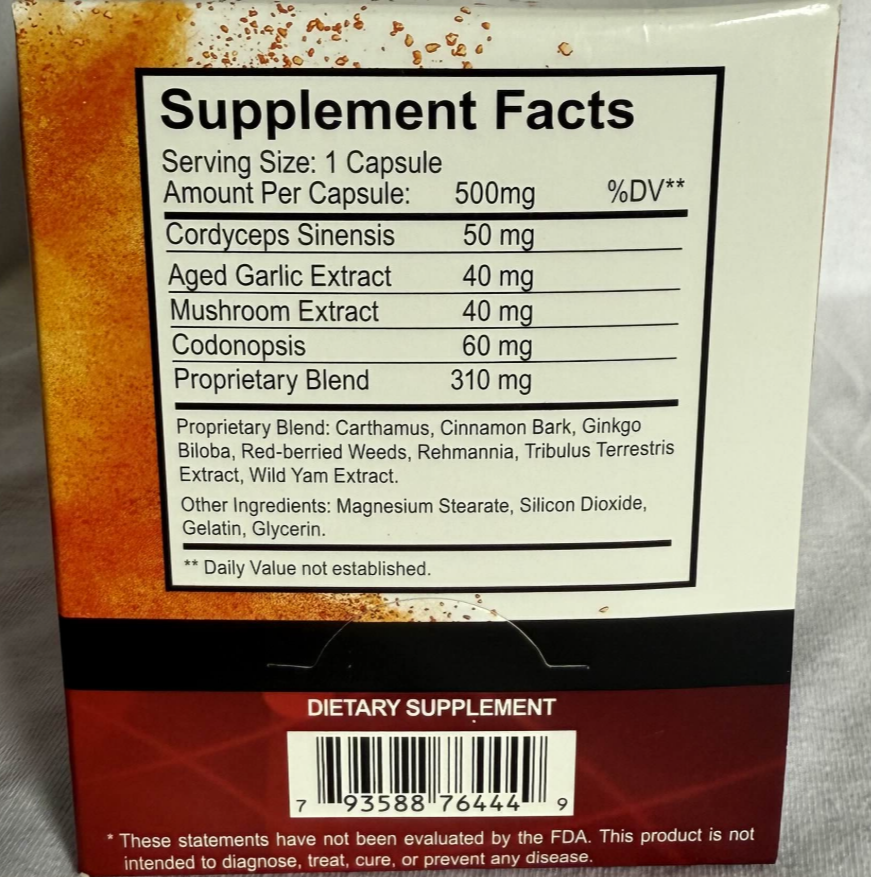 Ingredients: Cordyceps Sinesis, Aged Garlic Extract, Codonopsis, Proprietery Blend (Carthamus, Cinnamon Bark, Ginkgo Biloba, Red-berried Weeds, REHMANNIA, Tribulus Terrestris Extract, wild yam extract). Other ingredients include: magnesium stearate, silicon dioxide, gelatin, glycerin.