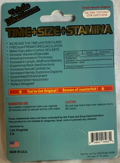 Take one capsule 30 minutes before sex to help energy, libido, and performance. Can also be used on a regular basis to maintain optimal condition of readiness before sex. For better result, take it one hour apart from taking other supplements or medications.